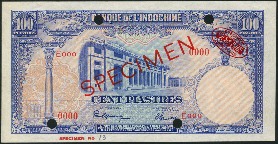 (†) Banque de l'Indochine, specimen 100 Francs, ND (1946), serial number E000 0000, blue on multicoloured underprint, BIC bank building at centre, reverse two junks in Halong Bay, overprinted SPECIMEN diagonally in red on obverse and reverse with one De La Rue specimen oval on obverse, SPECIMEN No 13 in lower margin, four punch holes