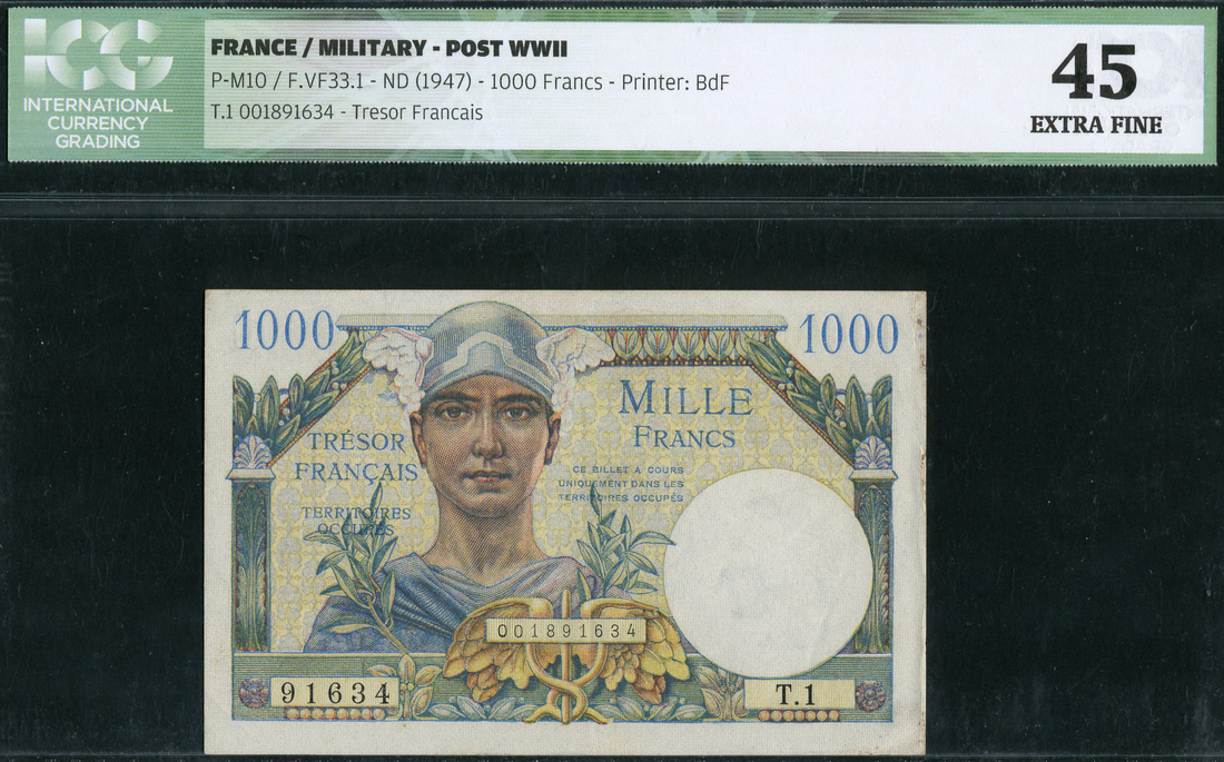 Tresor Francais, French Military issue, 1000 francs, ND (1947), serial numbers T.1 91634, blue and multicoloured, Mercury at left, caduceus low centre, reverse blue and multicoloured, maiden (France) reclining at left