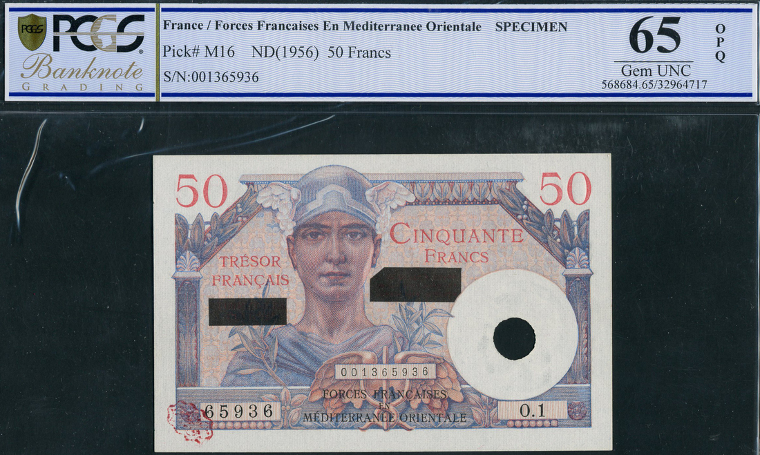 Tresor Francais, Forces Francaises Mediterranee Orientale, Suez Crisis, 50 francs, ND (1956), serial number O.1 65936, pink and mauve-pink, Mercury at left, value in red top left and right, reverse blue and pink, maiden reclining at left, value in red top left and right