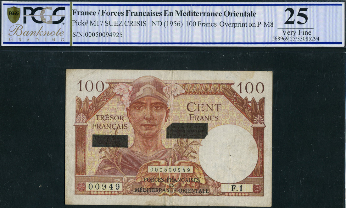 Tresor Francais, Forces Francaises Mediterranee Orientale, Suez Crisis, 100 francs, ND (1956), serial number F.1 00949, brown and pale mauve and yellow, Mercury at left, reverse brown and yellow, maiden reclining at left, value in red top left and right