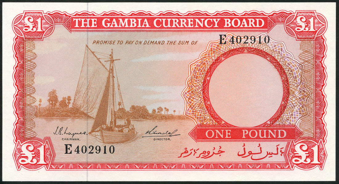 Gambia Currency Board, 10 shillings, £1, ND (1965), serial numbers A300741 and E402910, red and green respectively, bank title top centre, boat with palm trees in distance at centre left, also Caisse Central de la France d'Outre-Mer, 5 francs, ND (1943), serial numberAN166,622, red on pale orange and lilac underprint, medallic head at centre flanked by anchors and value