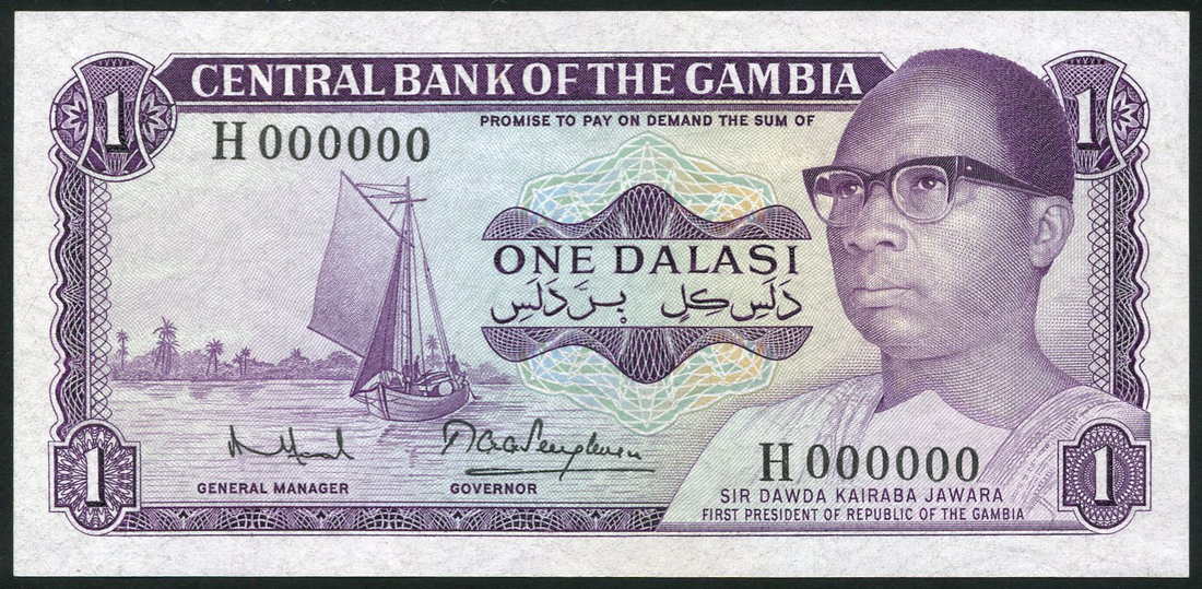 Central Bank of the Gambia, specimen 1 dalasi printed on 'Bradvek', ND (1982), serial number H000000, purple on multicolour underprint, President Dawda Kairaba Jawara at right, sailing boat at left, value at each corner, reverse purple, rice farmers