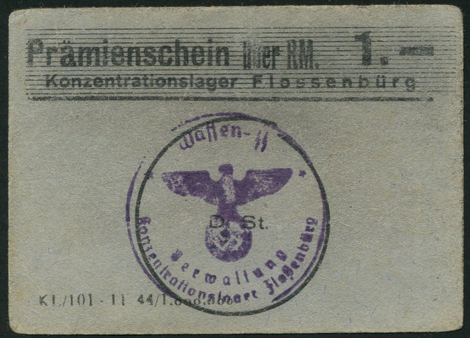 Konzentrationslager Flosenburg, 1 RM, 1944 issue, no serial number, black on blue paper, circle at centre with handstamp