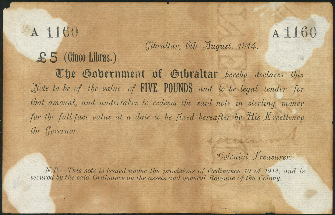 (x) Government of Gibraltar, Emergency World War I issue, £5, 6 August 1914, Series A, black serial number A1160, black text on grey-blue paper, manuscript signature of the Colonial Treasurer Alfred Craven Greenwood low right, faint CANCELLED handstamp across face of note