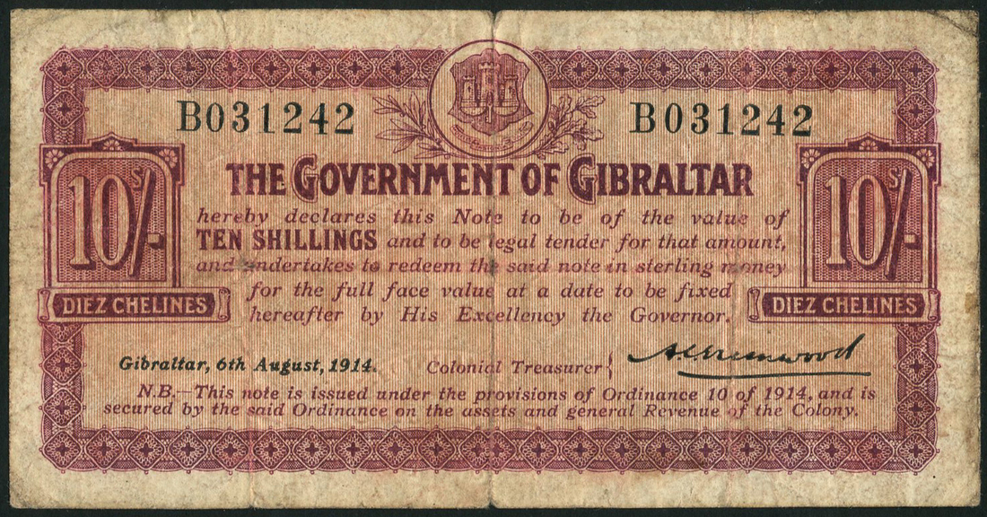 (x) Government of Gibraltar, 10 shillings, 6 August 1914, Series B, black serial number B265303, lilac text on cream paper, arms top centre, value at left and right, printed signature of the Colonial Treasurer Alfred Craven Greenwood low right