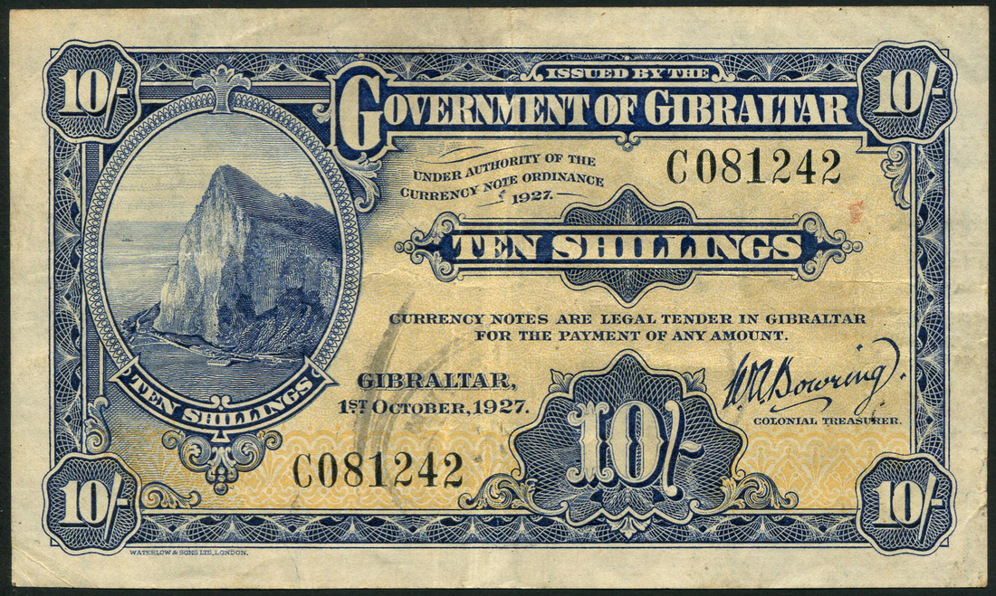 (x) Government of Gibraltar, 10 shillings, 1 October 1927, black serial number C081242, blue and yellow, the Rock at left, value in field, signature of Walter Andrew Bowring at right, reverse blue and white, arms at centre, value at left and right