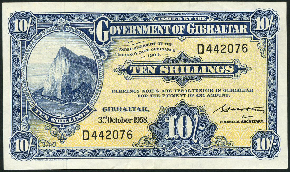 (x) Government of Gibraltar, 10 shillings, 3 October 1958, black serial number D 442076, blue and yellow, the Rock at left, value in field, signature of Charles Gomez at right, reverse blue and white, arms at centre, value at left and right