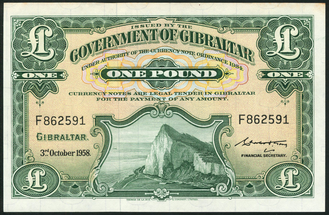 (x) Government of Gibraltar, 10 shillings, 3 October 1958, serial number D 236664, blue and pale yellow-orange, the Rock at left, value low left and at each corner, also £1, 3 October 1958, serial number F 862591, green and pale yellow, the Rock low centre, value top centre and at each corner, both are signed by Charles Gomez