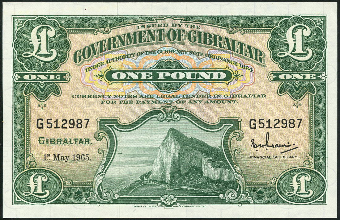 (x) Government of Gibraltar, 10 shillings, 1 May 1965, serial number D 532103, blue and pale yellow-orange, the Rock at left, value low left and at each corner, also £1, 1 May 1965, serial number G 512987, green and pale yellow, the Rock low centre, value top centre and at each corner, both are signed by Ernest Davis