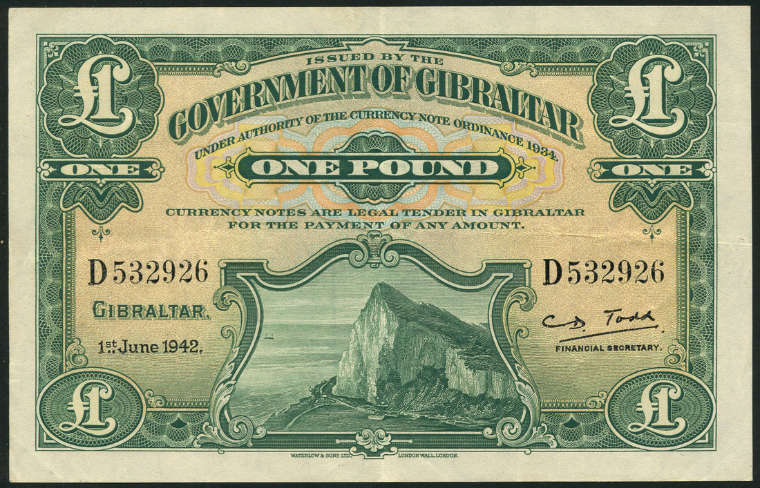 (x) Government of Gibraltar, £1, 1 June 1942, black serial number D 532926, green and orange-yellow, the Rock at low centre, value top centre and at each corner, signature of Charles Douglas Todd at right, reverse green and white, arms at centre, value at left and right