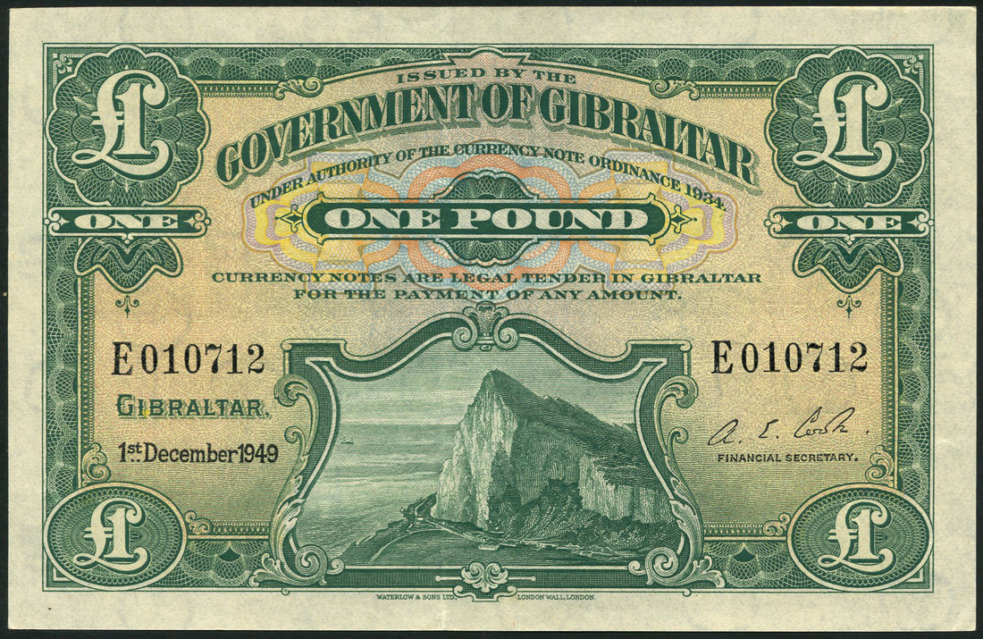 (x) Government of Gibraltar, £1, 1 December 1949, black serial number E 010712, green and orange-yellow, the Rock at low centre, value top centre and at each corner, signature of Alexander Cook at right, reverse green and white, arms at centre, value at left and right