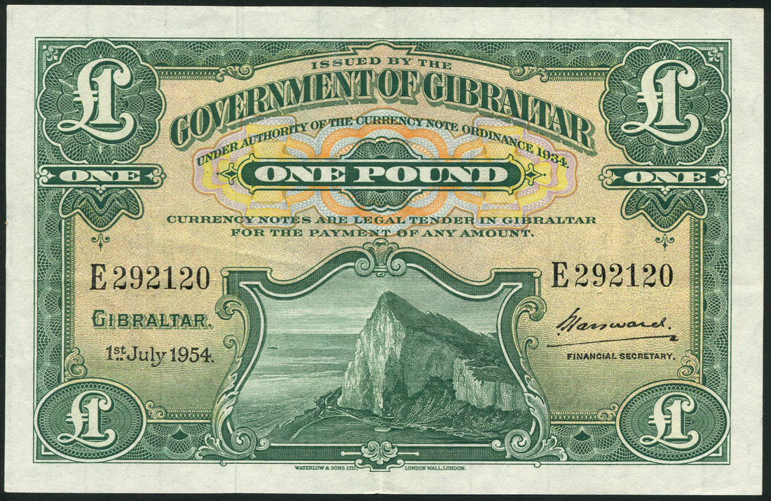 (x) Government of Gibraltar, £1, 1 July 1954, black serial number E 292120, green and orange-yellow, the Rock at low centre, value top centre and at each corner, signature of John Hayward at right, reverse green and white, arms at centre, value at left and right