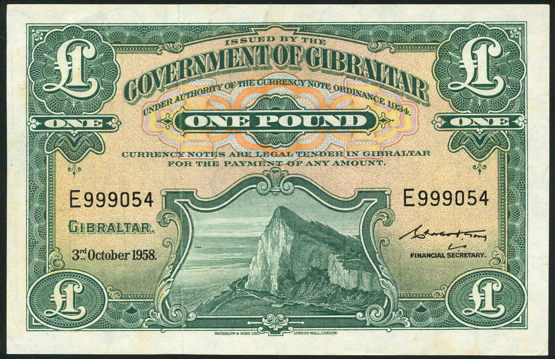 (x) Government of Gibraltar, £1, 3 October 1958, black serial number E 999054, green and orange-yellow, the Rock at low centre, value top centre and at each corner, signature of Charles Gomez at right, reverse green and white, arms at centre, value at left and right