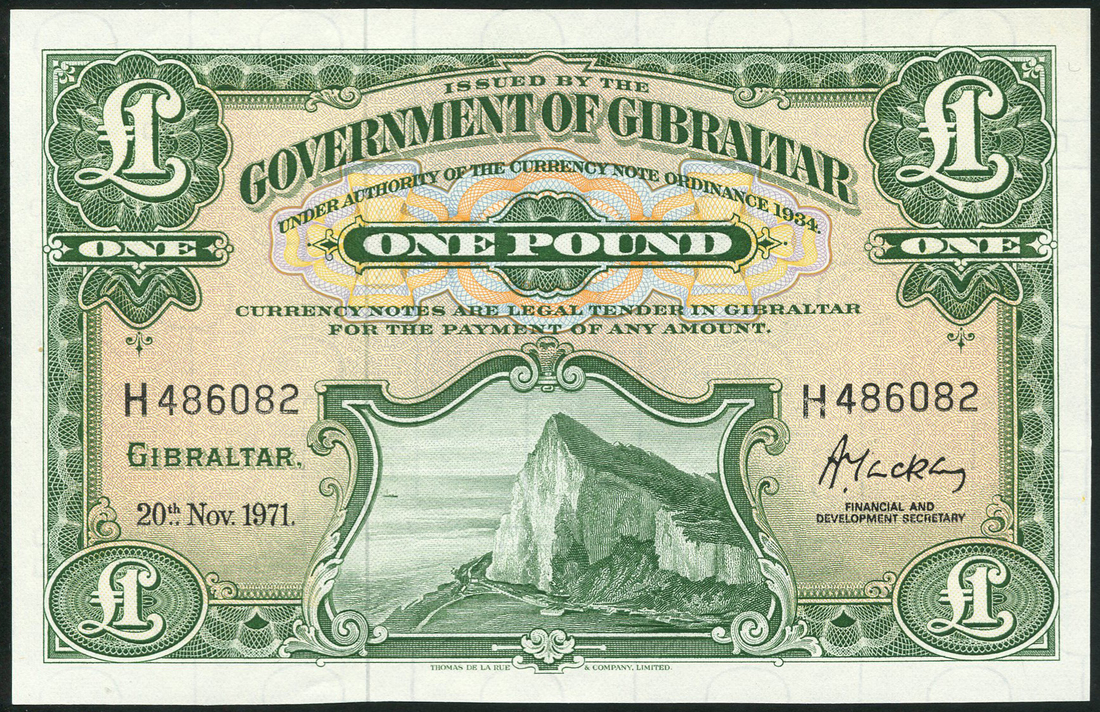 (x) Government of Gibraltar, £1 (2), 20 November 1971, 20 November 1975, serial numbers H 486082,H 608001, green and pale yellow, the Rock low centre, value top centre and at each corner, signed by Alistair MacKay and Alistair Collings respectively