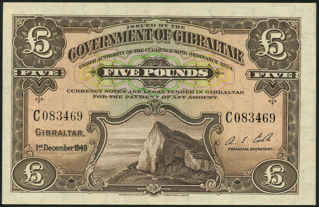 (x) Government of Gibraltar, £5, 1 December 1949, black serial number C 083469, brown and pink-orange, the Rock at low centre, value top centre and at each corner, signature of Alexander Cook at right, reverse brown and white, arms at centre, value at left and right