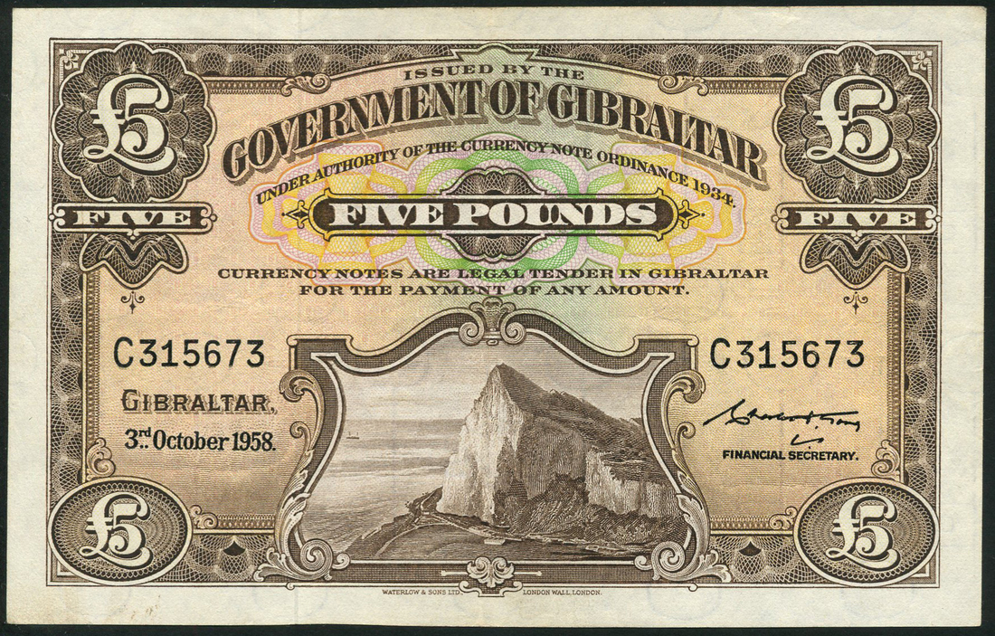 (x) Government of Gibraltar, £5, 3 October 1958, black serial number C 315673, brown and pink-orange, the Rock at low centre, value top centre and at each corner, signature of Charles Gomez at right, reverse brown and white, arms at centre, value at left and right