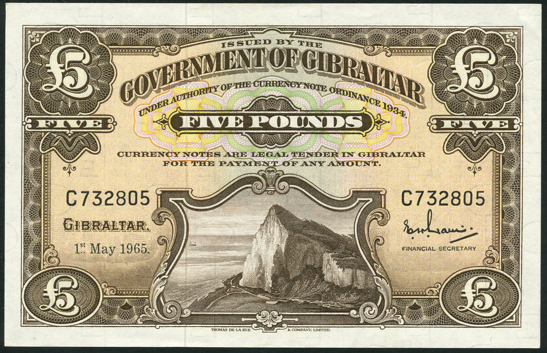 (x) Government of Gibraltar, £5, 1 May 1965, black serial number C 732805, brown and pink-orange, the Rock at low centre, value top centre and at each corner, signature of Ernest Davis at right, reverse brown and white, arms at centre, value at left and right