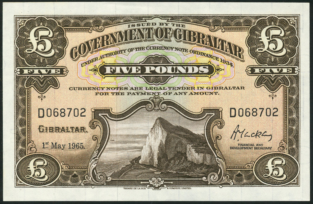 (x) Government of Gibraltar, £5, 1 May 1965, black serial number D 068702, brown and pink-orange, the Rock at low centre, value top centre and at each corner, signature of Alistair MacKay at right, reverse brown and white, arms at centre, value at left and right