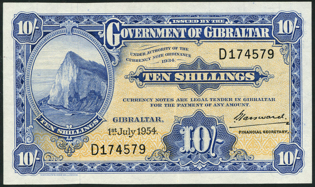 Government of Gibraltar, 10 shillings, 1 July 1954, serial number D 174579, blue and yellow, the Rock at left, value in field, printed signature of John Hayward, reverse blue and white, arms at centre, value at left and right
