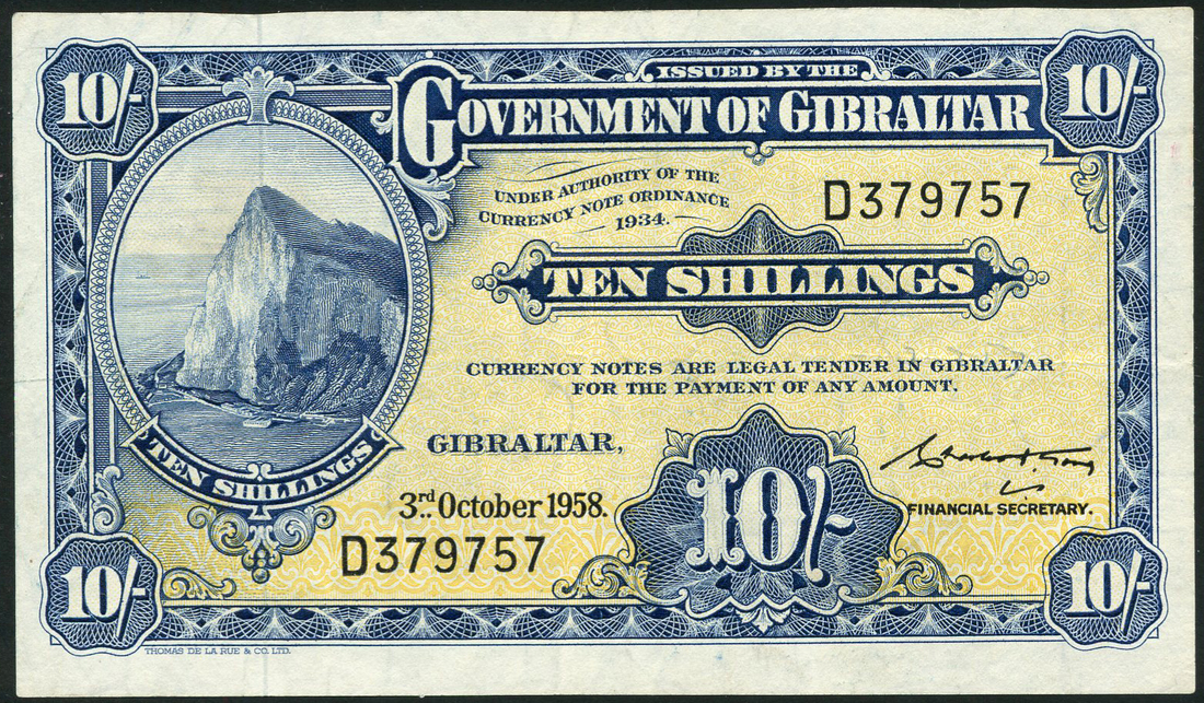 Government of Gibraltar, 10 shillings, 3 October 1958, serial number D 379757, blue and yellow, the Rock at left, value in field, printed signature of Charles Gomez, reverse blue and white, arms at centre, value at left and right