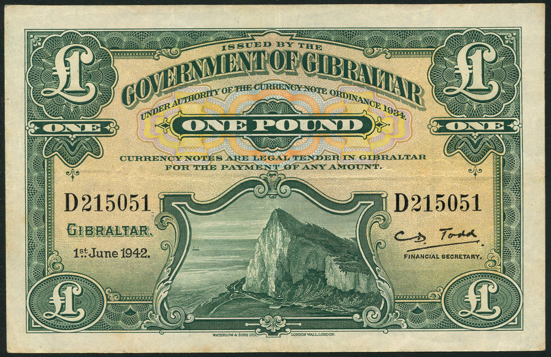 Government of Gibraltar, £1, 1 June 1942, D 215051, green and pale pink and orange, the Rock at low centre, value in field, printed signature of Charles Todd, reverse green and white, arms at centre, value at left and right