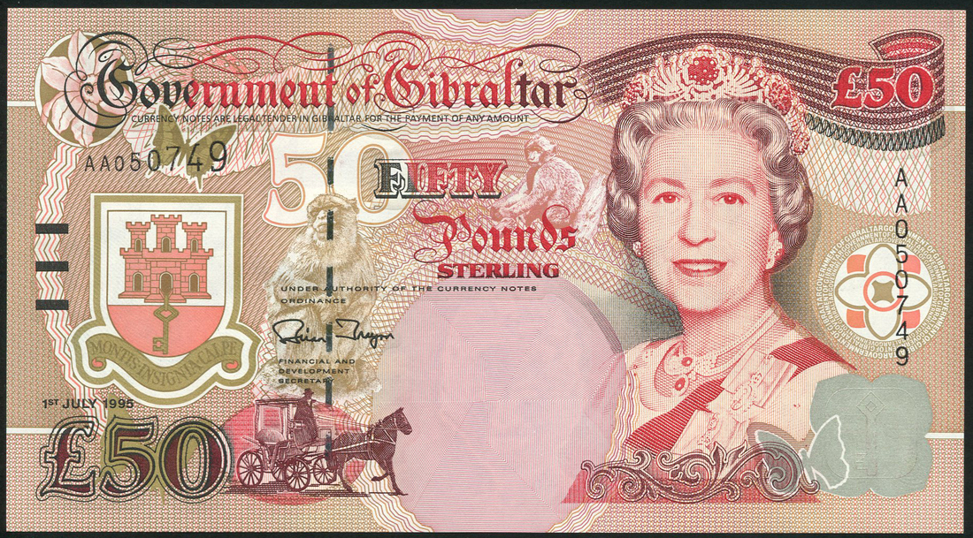Government of Gibraltar, £50, 1 July 1995, serial number AA050749, also, £10, 10 September 2002, serial number B001698, red on multicolour underprint, portrait Queen Elizabeth II at right, coat of arms at left with bank title above, the £50 marks the anniversary of the death of Winston Churchill