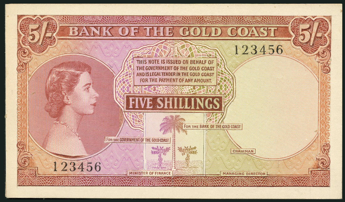 Bank of the Gold Coast, an obverse and reverse composite essay for a 5/-, ND (30 April 1953), serial number 123456, red-brown and lilac, young Queen Elizabeth II at left, palm tree low centre, value at centre, top left and right, reverse red-brown and pale green, logging scene