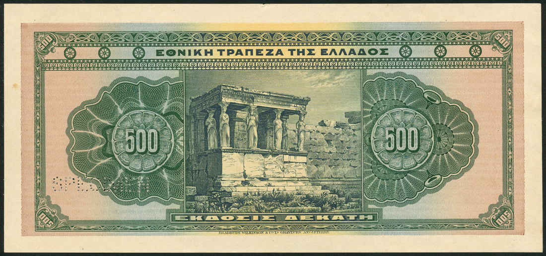 (x) National Bank of Greece, a uniface reverse proof of a 500 drachmai, ND (type of 1923), green and pink, ruins at centre, value at left and right