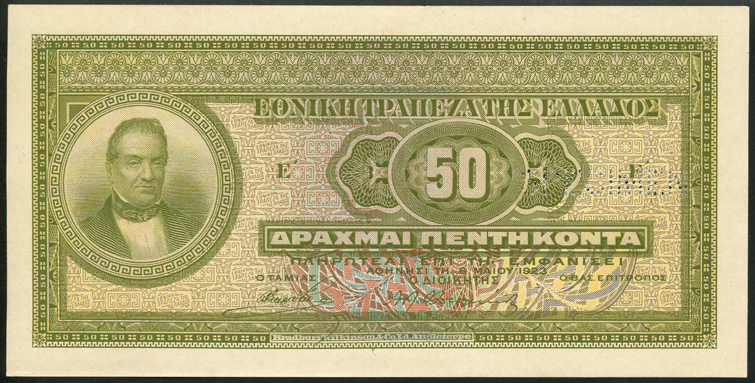 (x) National Bank of Greece, an obverse and reverse uniface proof 50 drachmai, 6 May 1923, green and multicoloured, George Stavros at left, value right centre, reverse, blue and pale pink-mauve, helmeted maiden at centre, also a reverse proof 25 drachmai, purple and pale blue, temple at centre, and a reverse 100 drachmai, purple, church at centre