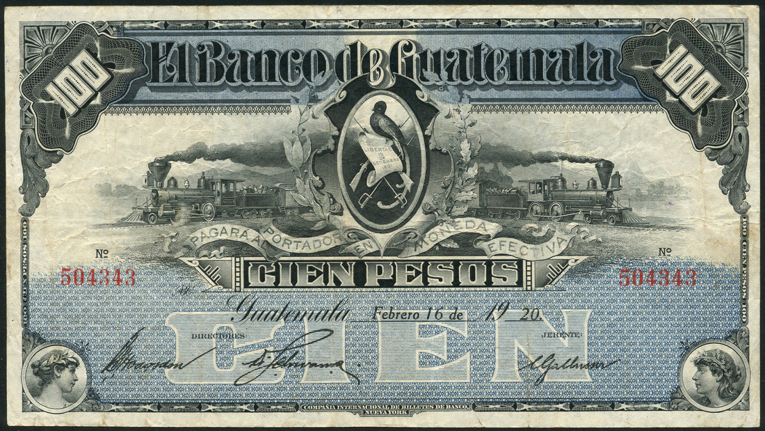 El Banco de Guatemala, 100 pesos (2), 16 February 1920, serial number 504343, 16 January 1925, serial numbers 764119 and 092119, black on blue underprint, allegorical maiden at low left and right, arms at centre flanked by steam trains