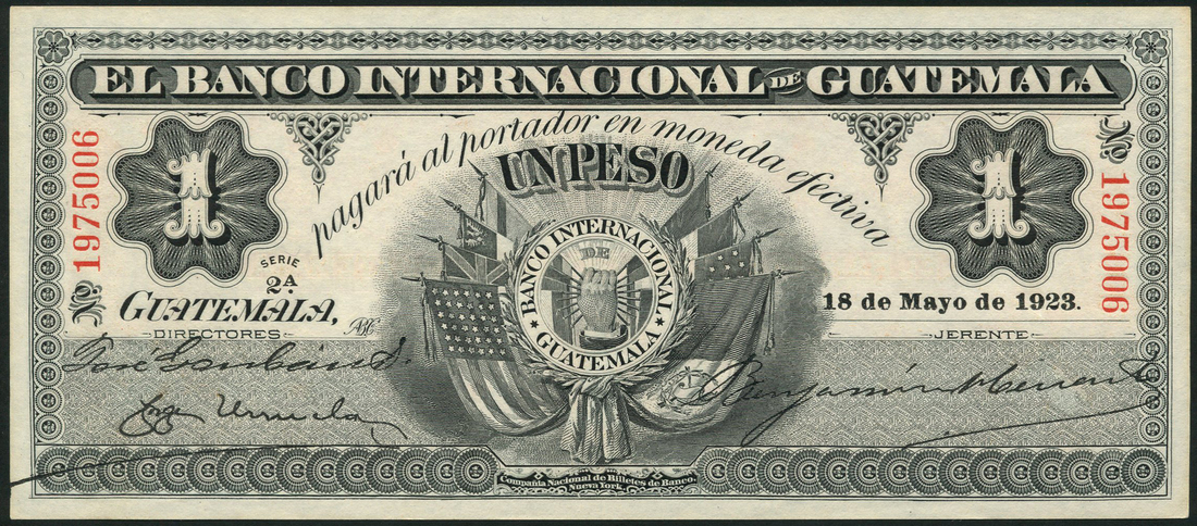 El Banco Internacional de Guatemala, a group of 1 peso (17), 18 May1923, black print, hand holding eight flags, value at left and right