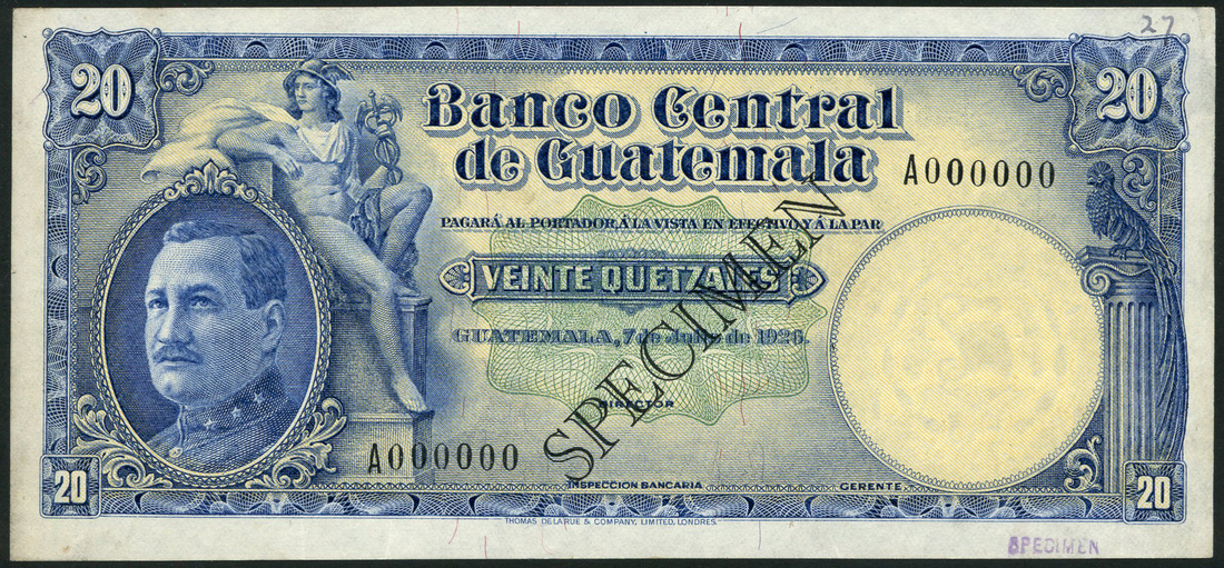 (†) Banco Central de Guatemala, specimen 20 quetzales, 7 July 1926, serial number A000000, blue on yellow, framed portrait of Gen J Maria Orellana at left, mercury reclining at left, reverse blue, palace of the Captains General, black SPECIMEN overprint
