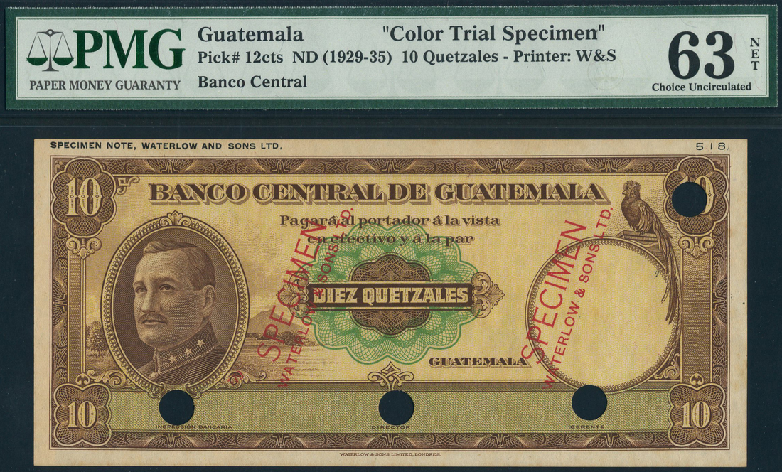 (x) Banco Central de Guatemala, colour trial 10 quetzales, ND (ca 1929), brown, yellow and green, General J.Maria Orellana at left, quetzal bird on column at right, reverse blue, bridge at centre