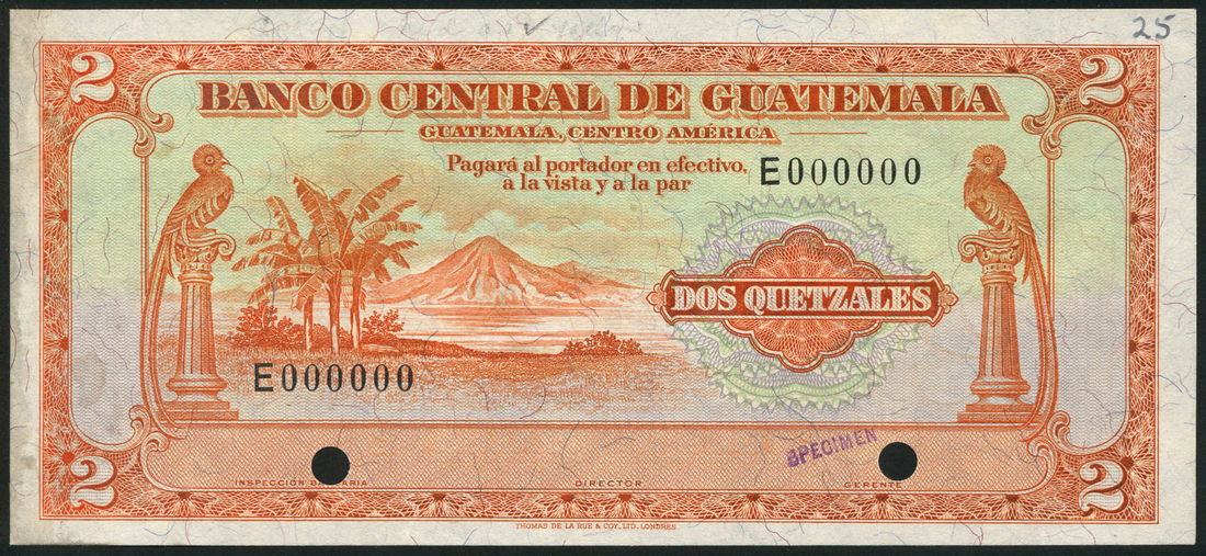 (†) Banco Central de Guatemala, specimen 2 quetzales, ND (1936), serial number E 000000, orange on light green, mountains and lake side at left, reverse orange, hole punched cancelled