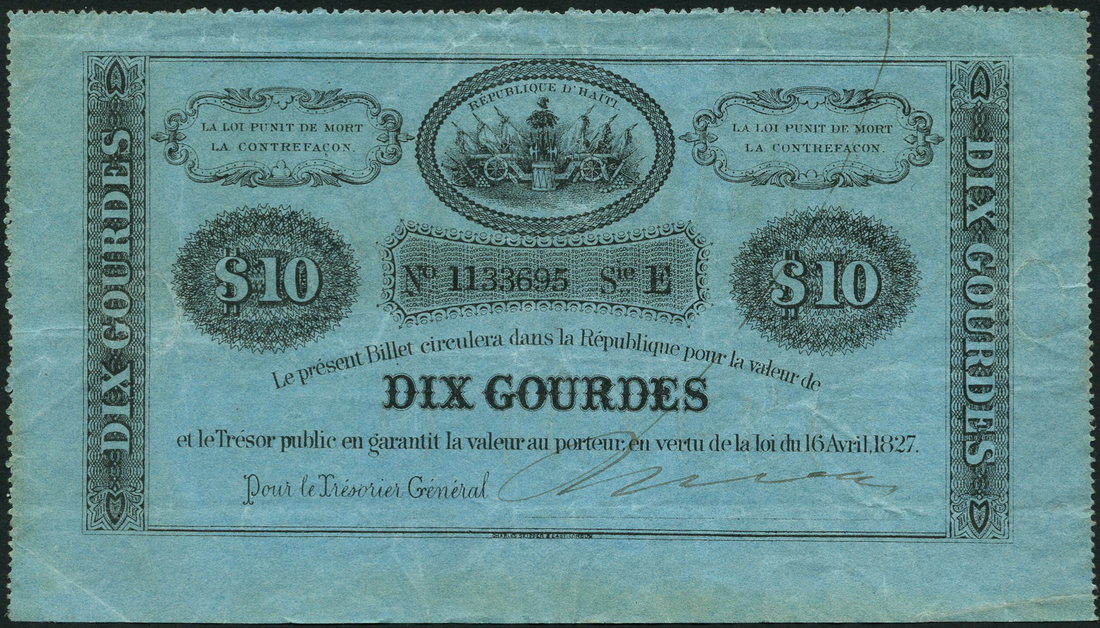 Haiti, 2 gourdes, 10 gourdes and 25 gourdes, 16 April 1827, serial numbers 841465, 1133695 and 1203014, uniface, yellow, blue and green respectively