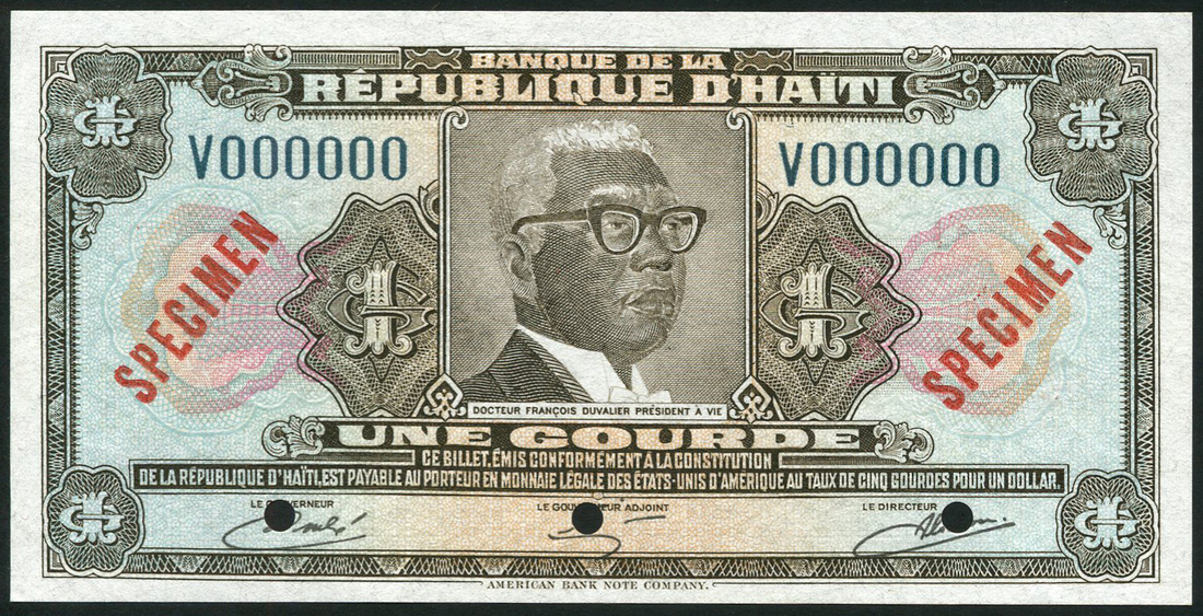 Republique d'Haiti, specimen 1 gourde, 1979 (1982), serial number V000000, brown on multicolour underprint, Docteur Francois Duvalier President a Vie at centre, red SPECIMEN overprints, three cancellation holes
