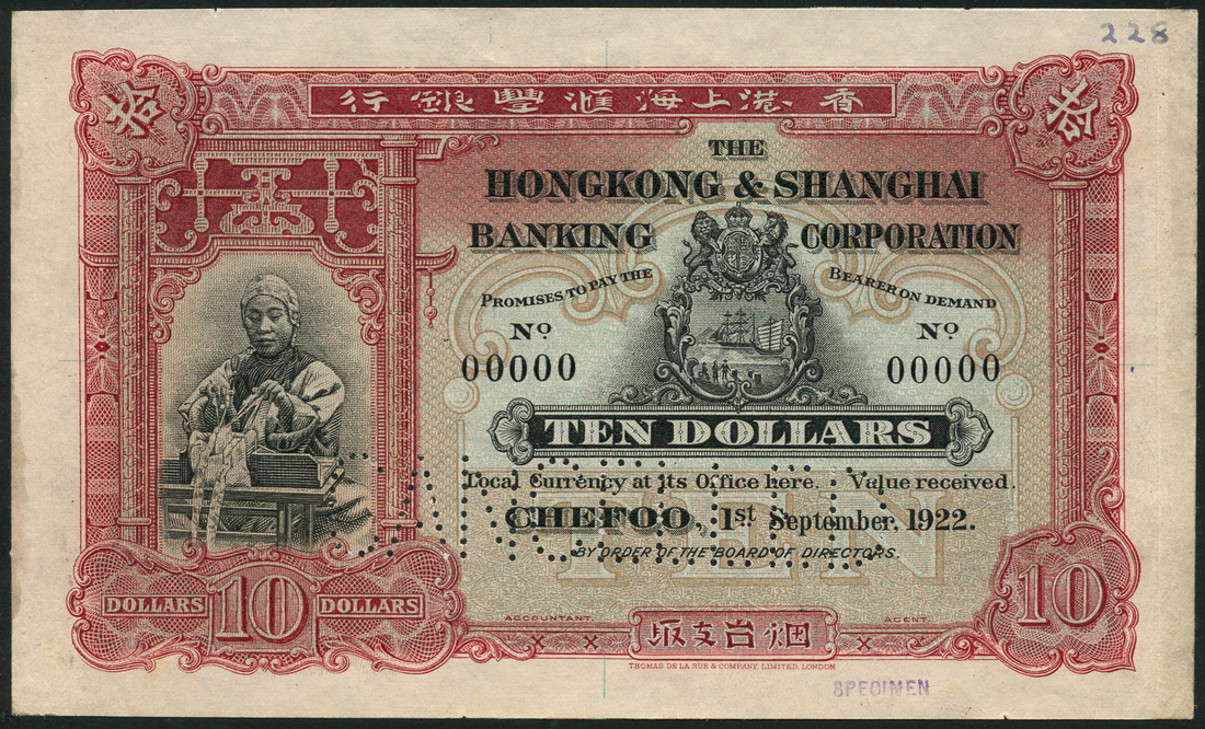 (†) Hong Kong & Shanghai Banking Corporation, colour trial $10, Chefoo, 1 September 1922, serial number 00000, red on brown and blue underprint, lace maker at left, arms at centre-right, value at right and at each corner, reverse red, bank buildings at left and right, CANCELLED perforation