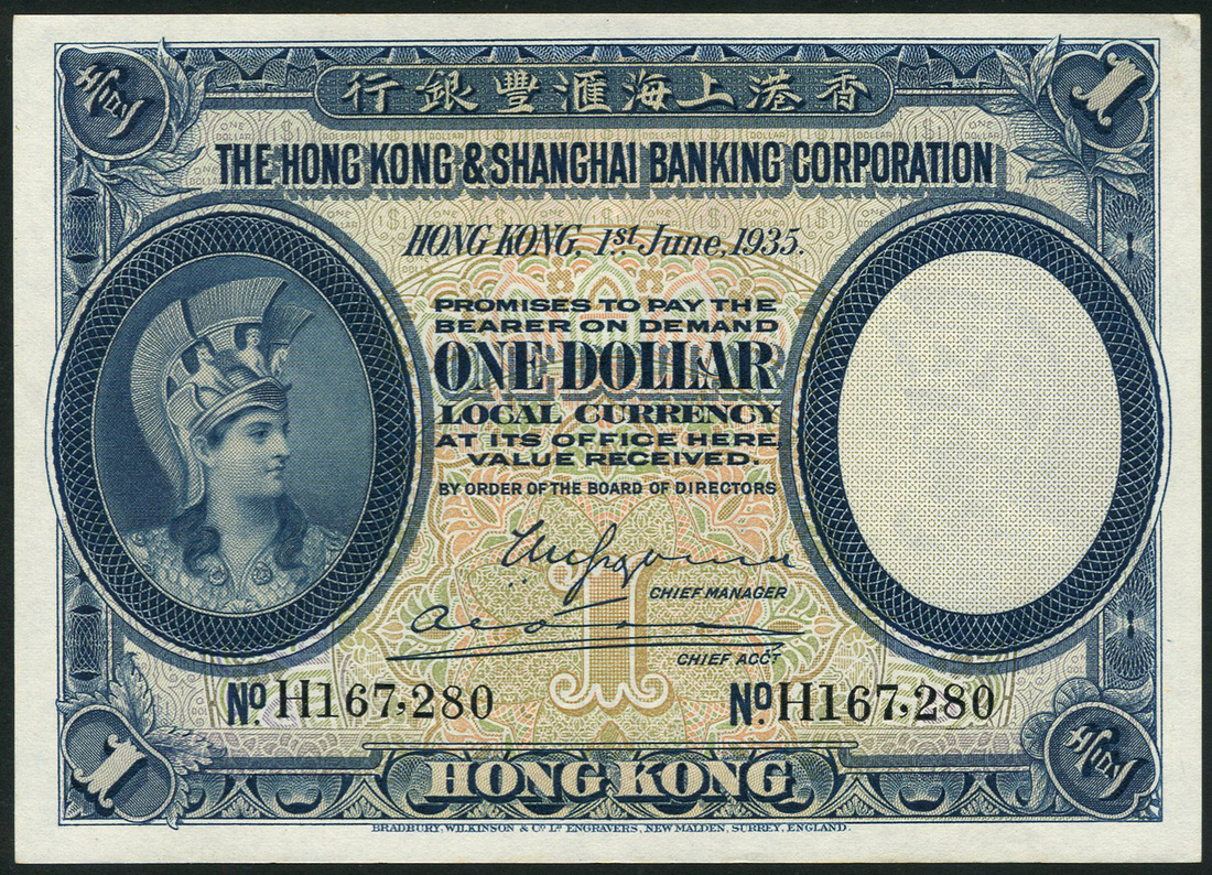 Hong Kong & Shanghai Banking Corporation, $1, 1 June 1935, serial number H 167280, blue and green and pink, helmeted head of Minerva at left, two printed signatures at low centre, reverse purple, seated maiden at centre, arms of the bank at right, value low centre, value at each corner