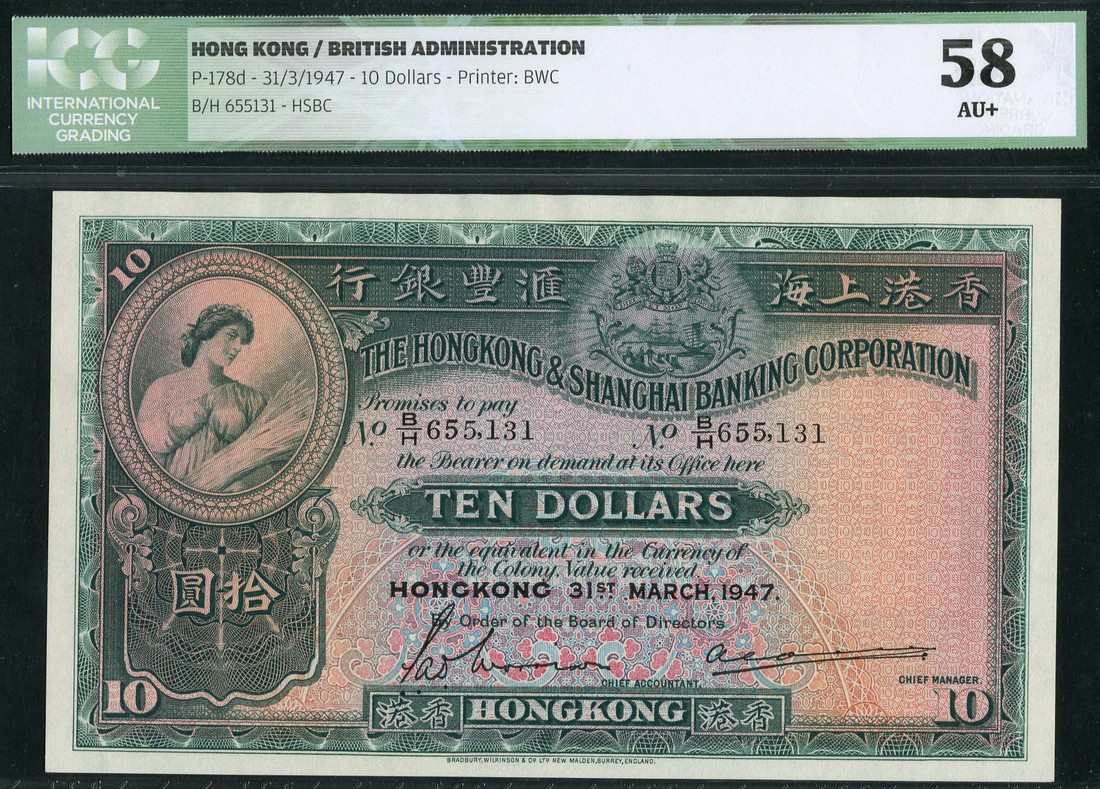 Hong Kong & Shanghai Banking Company, $10, 31 March 1947, serial number B/H 655131, blue-green, Ceres top left, arms top right, two printed signatures, reverse bank head office