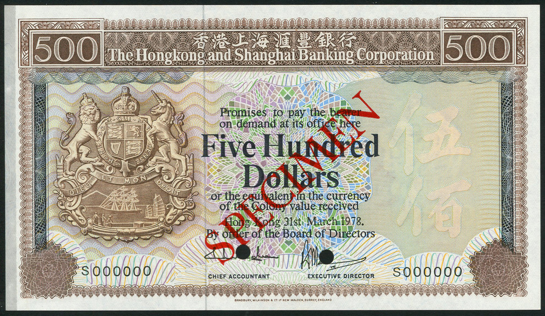 Hong Kong & Shanghai Banking Corporation, specimen $500, 31 March 1978, serial number S 000000, purple-brown and multicoloured, arms at left, reverse brown, lion from the forecourt of the Hong Kong bank building in Hong Kong
