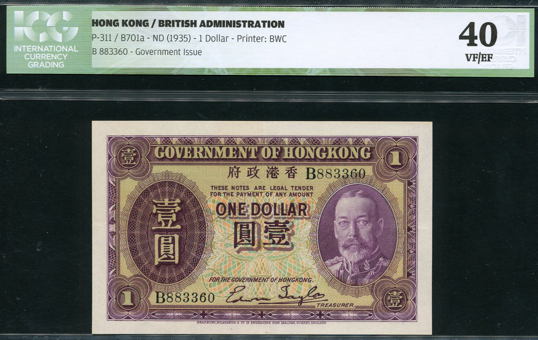 Government of Hong Kong, $1, ND (1935), serial number B 883360, purple and pale green and pink, George V at right, value at left, Taylor signature
