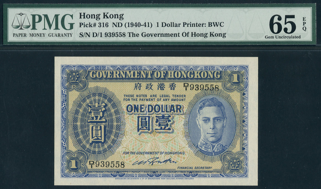 Government of Hong Kong, $1, ND (1940-41), serial number D/1 939558, blue on light yellow and multicolour underprint, portrait King George VI at right, value in each corner and at centre, reverse, blue, guilloche pattern