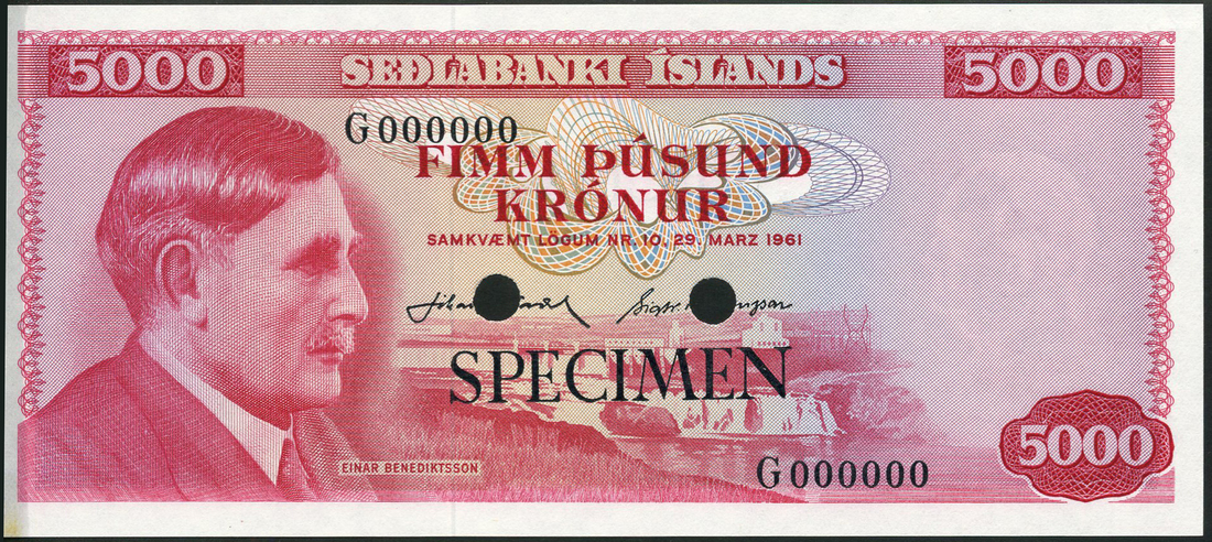 (†) Sedlabanki Islands, Iceland, a group of specimen colour trials, Law of 1961, all zero serials, comprising 10 Kronur, prefix BA, blue, Jon Eriksson at left; 25 Kronur, prefix CA, green, Magnus Logmadur at left; 500 Kronur, prefix F, purple, Hannes Hafstein at left; 1000 Kronur, prefix EA, green, Jon Sigurdsson at right; and 5000 Kronur, prefix G, red, Einar Benediktsson at left, all overprinted SPECIMEN in red or black on obverse and reverse, two punch holes