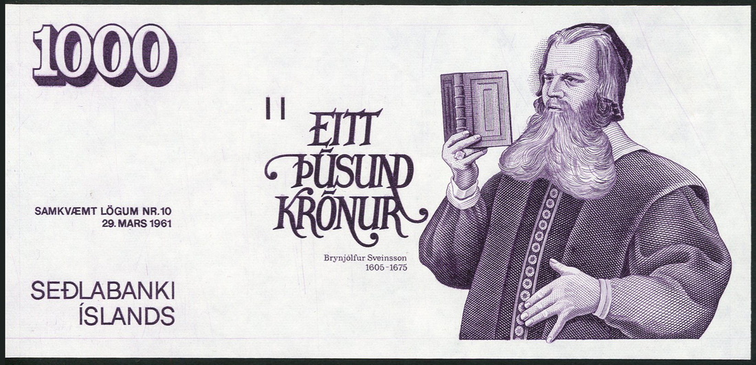 (†) Sedlabanki Islands, Iceland, printer's obverse and reverse uniface die proofs, 1000 Kronur, Law of 1961, one pair in black, the second pair in purple, both Brynjolfur Sveinsson at right, reverse wooden church