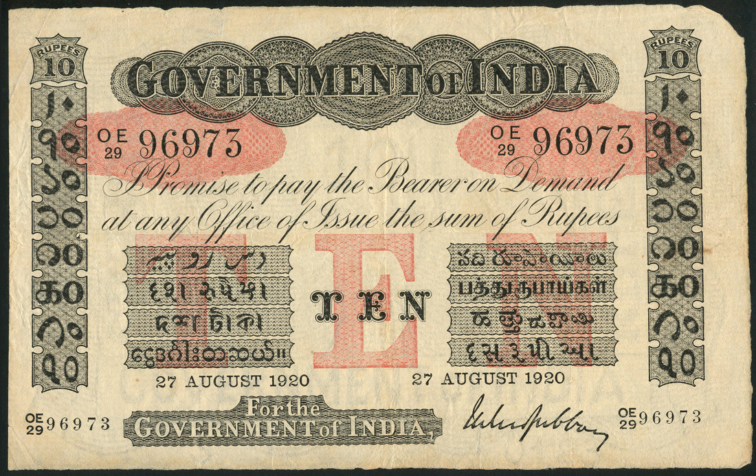 (x) Government of India, 10 rupees, Cawnpore, 27 August 1920, serial number OE/29 96973, black and white, value in pink underprint low centre, Gubbay signature