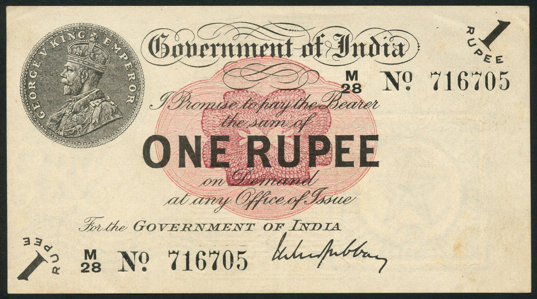 Government of India, 1 rupee, ND (1917), serial number M/28 716705, black on red underprint, coin depicting George V at top left, M.M.S Gubbay signature