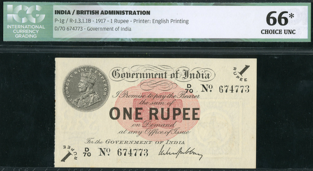 Government of India, 1 rupee, ND (1917), serial number D70 674773, black and white with value in red underprint at centre, 1 rupee coin top left, value at centre, Gubbay signature low right, rayed star in square watermark