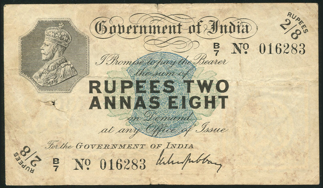 Government of India, 2 rupee 8 annas, ND (1918), prefix B/7, Bombay, black and white, George V portrait top left, pale blue central guilloche, Gubbay signature