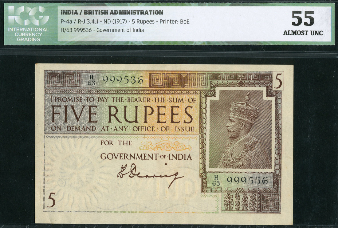 Government of India, 5 rupees, ND (1917-30), serial number H63 999536, brown, violet and green, George V top right, Denning signature low right