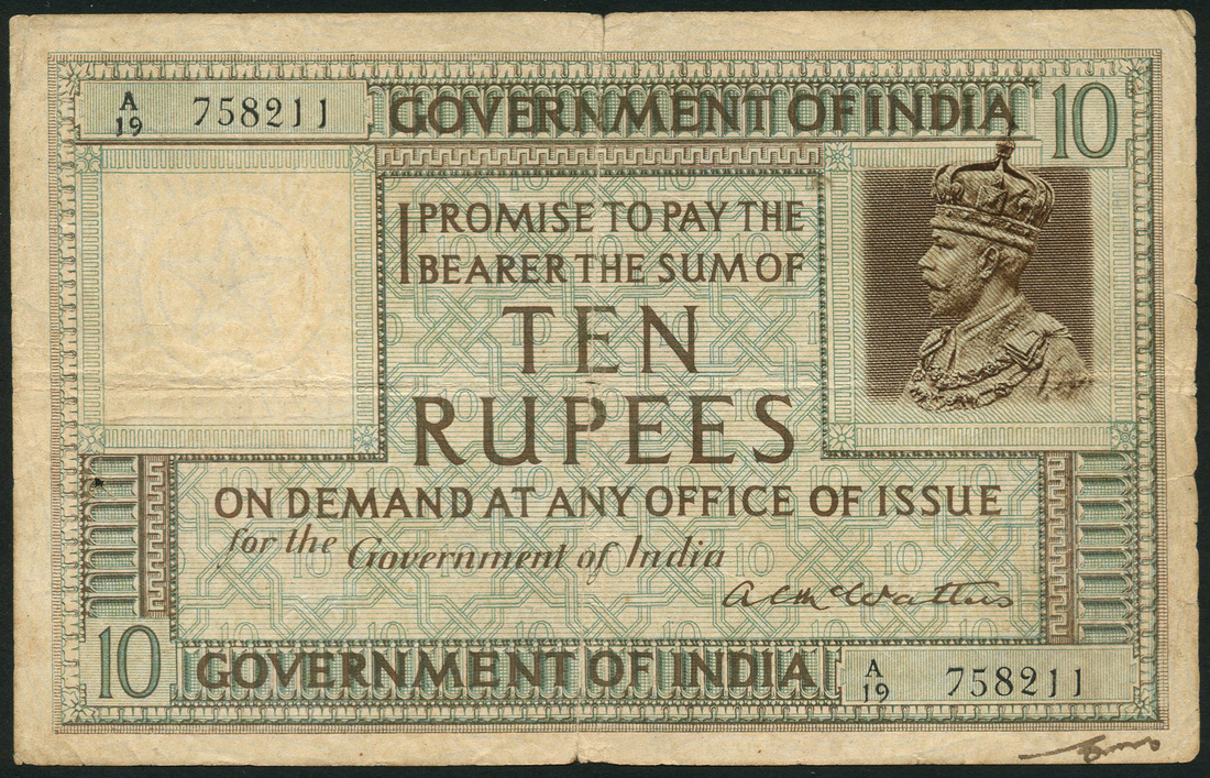 (x) Government of India, 10 rupees, ND (May 1923), serial number A/19 758211, A.C. McWatters signature variety, blue and brown, head of King George V in brown panel at right